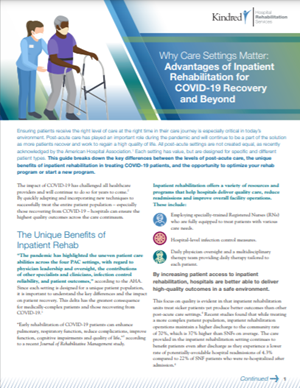 This guide breaks down the key differences between the levels of post-acute care, the unique benefits of inpatient rehabilitation in treating COVID-19 patients, and the opportunity to optimize your rehab program or start a new program.