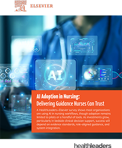 In the HealthLeaders AI in Nursing survey, supported by Elsevier, nurse leaders report that AI is already being used in nursing environments across their organizations. While adoption remains split between small pilots (49%) and a handful of tools (52%), plans call for upcoming AI investments over the next few years.