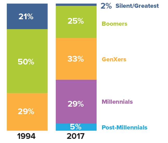 NOTE: Labor force includes those ages 16 and older who are working or looking for work. Annual averages shown. SOURCE: Pew Research Center https://www.pewresearch.org/short-reads/2018/04/11/millennials-largest-generation-us-labor-force/