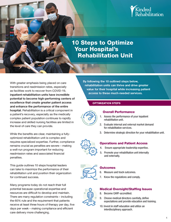 With greater emphasis being placed on care transitions and readmission rates, inpatient rehabilitation units are looking for ways to enhance patient access and maximize hospital performance. Read this guide to discover 10 steps to facility success.