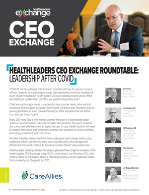 Recently, HealthLeaders sat down with three longtime members of the CEO Exchange to discuss future strategies and procedures for handling a variety of post-COVID issues that healthcare leaders will face, including the balance of new, consumer-demanded tools that have expanded access to care with questions of clinical workflow, technology investment, and cost of care.