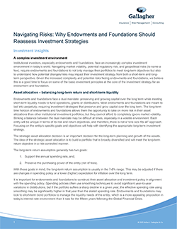 Endowments and foundations face a dual mandate: preserving and growing capital over the long term while meeting short-term liquidity needs to fund operations, grants or distributions. This is increasingly challenging in today’s complex investment environment. Most endowments and foundations are meant to last into perpetuity, requiring investment strategies that preserve and grow capital over the long term. This long-term time horizon allows them the opportunity to take on more risk in their asset allocations than other institutional investment portfolios, but they cannot afford to completely ignore market volatility. Striking a balance between the dual mandate may be difficult at times, especially in a volatile environment.